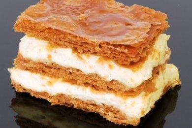 Σε μία πιατέλα μακρόστενη βάζουμε ένα κομμάτι από τα τρια σφολιάτας και απλώνουμε από πάνω τη μισή κρέμα έπειτα βάζουμε το άλλο κομμάτι σφολιάτας και απλώνουμε την υπόλοιπη κρέμα τέλος βάζουμε και το τρίτο κομμάτι σφολιάτας πασπαλίζουμε με άχνη και το γαρνίρουμε με κρέμα αν μας έχει περισσέψει.